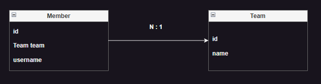 - Member 엔티티는 Team 엔티티의 클래스를 필드로 갖고 있음